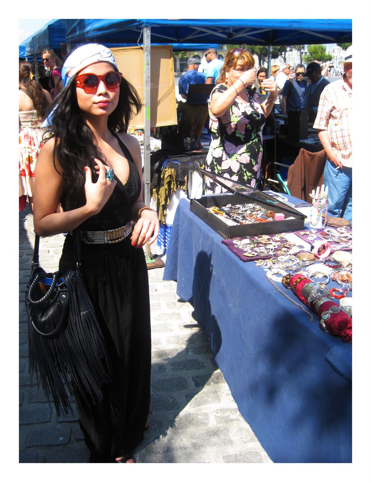 Strutting down flea market it Barcelona in Vintage maxi number, River Island belt, Bag&Ring from H&M, Scarf used as a headband & Sunnies: Vintage.