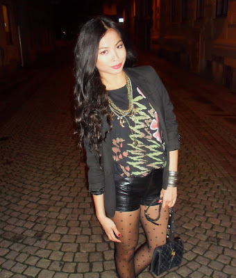 SATURDAY-eve meeting friends- Shirt/cut out sleeves-Vintage, Faux leather pants- Gina tricot, Tights-H&M, nude wedges- from Milan, Vintage clutch used with vintage belt as a strap, jewelries-from Milan and Vintage. Blazer also Vintage. (I know a lot of vintages ha!)