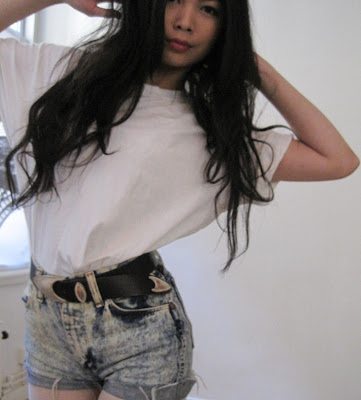 I stole this one from Elmar and I love the size of it plus I was able to fold up the sleeves a little which I like, worn it with my vintage wranglers denim shorts, vintage leather belt and pale pink tights from Topshop.