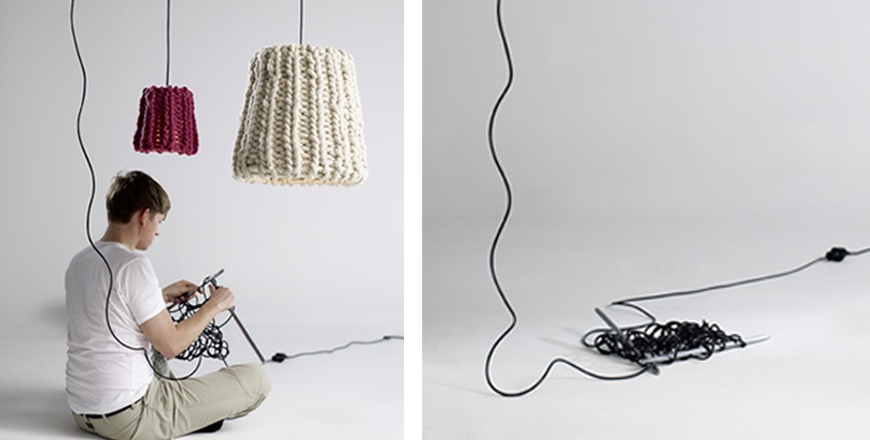 En ég hef einu sinni klippt ermar af ullarpeysu og sett utan um tvo (minni) skerma á lampa, kannski þú gætir fundið grófprjónaðan trefil í rauða krossinum og saumað hann utan um skerm?